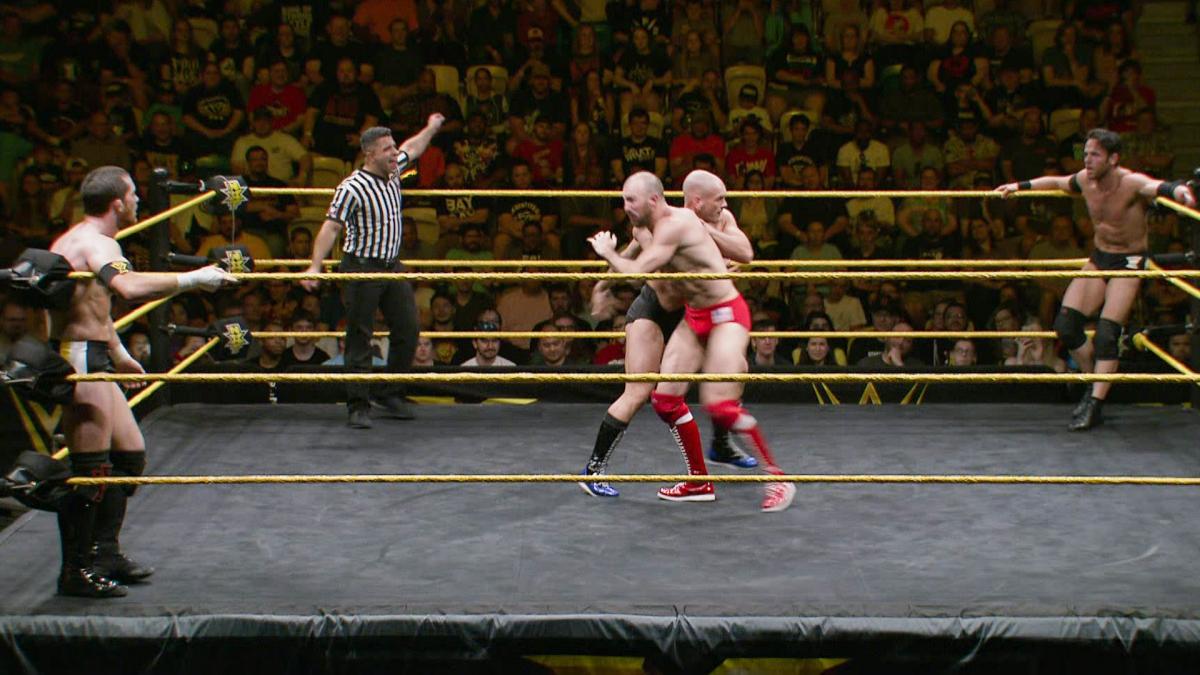 O’Reilly applies a guillotine choke. Lorcan blasts O’Reilly with a knife edge chop. Lorcan knocks Strong off the ring apron. Lorcan creates distance with a Running BlockBuster. Lorcan tags in Burch. Burch with two haymakers. Burch ducks a clothesline from Strong. Burch with a Back Body Drop. Burch with rapid fire haymakers. Burch delivers a ShotGun Dropkick. Burch with an Exploder Suplex. Burch is fired up. Burch fights out of the fireman’s carry position. Burch goes for an O’Connor Roll, but Strong holds onto the top rope. O’Reilly tags himself in. Burch dumps Strong out of the ring. Burch avoids Ax and Smash. Burch HeadButts O’Reilly. Burch PowerBombs O’Reilly for a two count. Burch locks in The Crippler Cross Face.