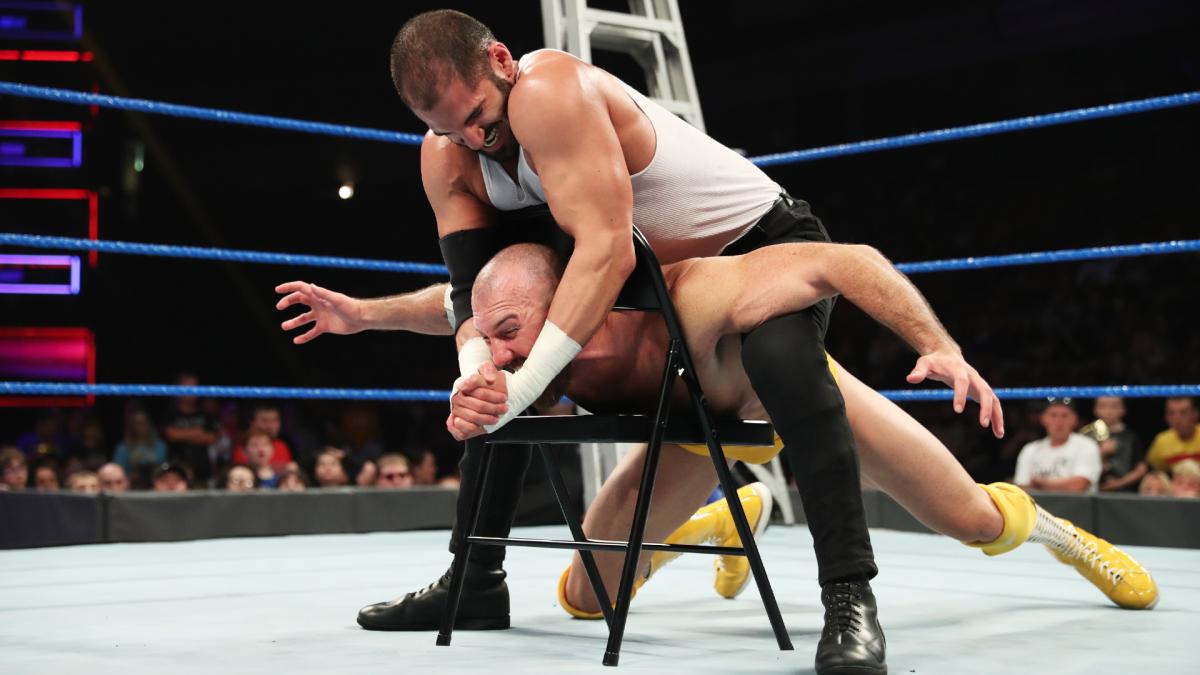 Lorcan and Daivari are not waiting for the bell to ring. Lorcan ducks a clothesline from Daivari. Lorcan with a running clothesline. Lorcan launches Daivari over the top rope. Lorcan slams Daivari’s head on the steel ring steps. Lorcan slings three chair into the ring. Lorcan with Two Running Elbow Strikes. Daivari sends Lorcan to the floor. Daivari slams Lorcan’s head on the announce table. Daivari grabs a trash can. Lorcan kicks Daivari in the gut. Lorcan with a Vertical Suplex on the floor. Daivari whips Lorcan into the ringside barricade. Daivari brings out a ladder from under the ring. Daivari wraps a steel chain around Lorcan’s face. Daivari with a knife edge chop. Daivari kicks Lorcan in the gut. Lorcan throws Daivari into the ladder in the corner. Lorcan goes for a Vertical Suplex, but Daivari blocks it. Daivari with a heavy chop. Lorcan reverses out of the irish whip from Daivari. Lorcan Hip Tosses Daivari into the ladder for a two count.