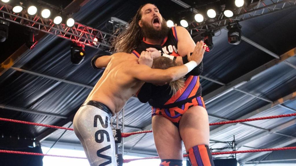 Imperium hits their SpineBuster/PK Combination. Huxley with two uppercuts. Barthel kicks Huxley in mid-air. Barthel with a Running European Uppercut. Barthel repeatedly stomps on Huxley’s chest. Barthel is raining down forearms in the corner. Barthel with a double throat chop. Barthel tags in Aichner. Imperium is double teaming Huxley. Barthel has Huxley draped outside the middle rope. Imperium with Stereo Basement Dropkicks. Imperium poses for the crowd.