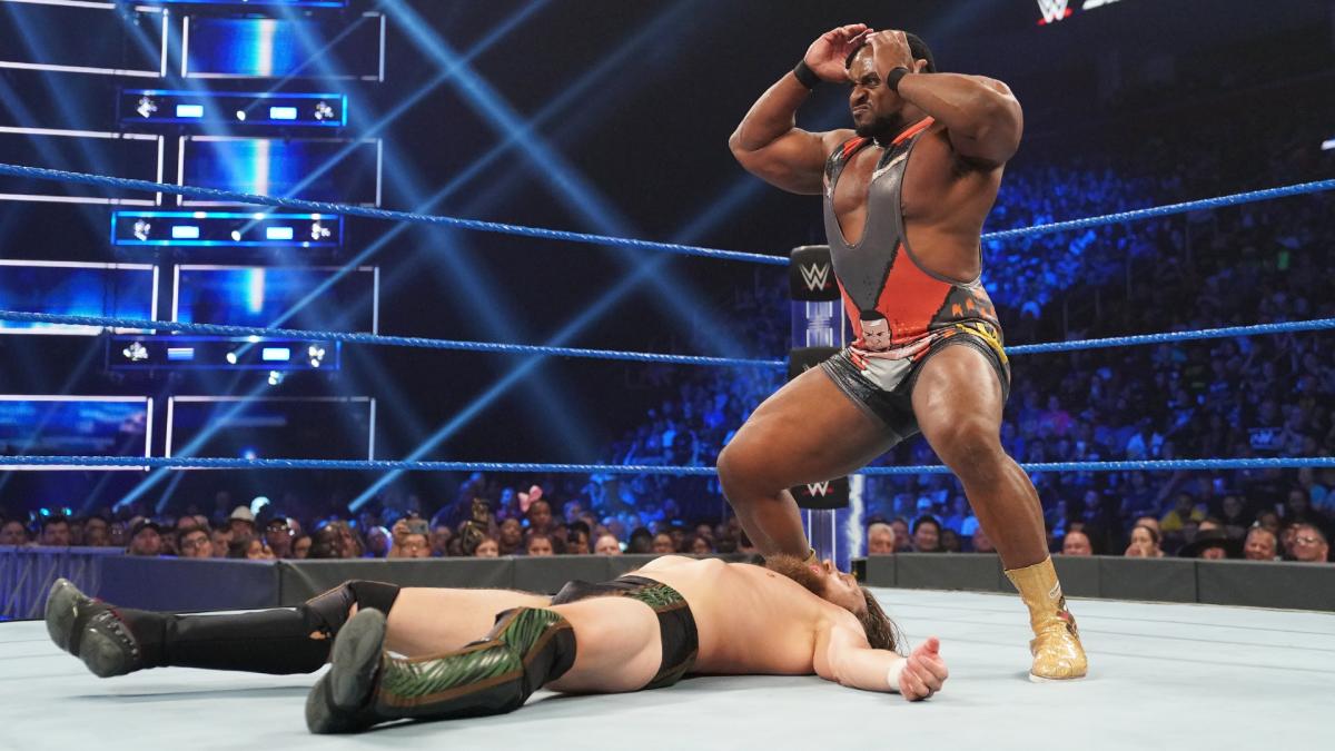 Rowan drops Big E with a Spin Kick for a two count. Rowan tells Big E to get up. Big E gets fights out of the fireman’s carry position. Woods with an Apron Enzuigiri. Big E follows that with a Running Lariat. Woods lands The Limit Break for a two count. Big E Spears Bryan out of the ring. Rowan nails Woods with the steel ring steps which causes the disqualification. After the match, Bryan repeatedly stomps on Woods face. Bryan poses for the crowd. Rowan hits The Iron Claw. Bryan connects with The Running Knee.