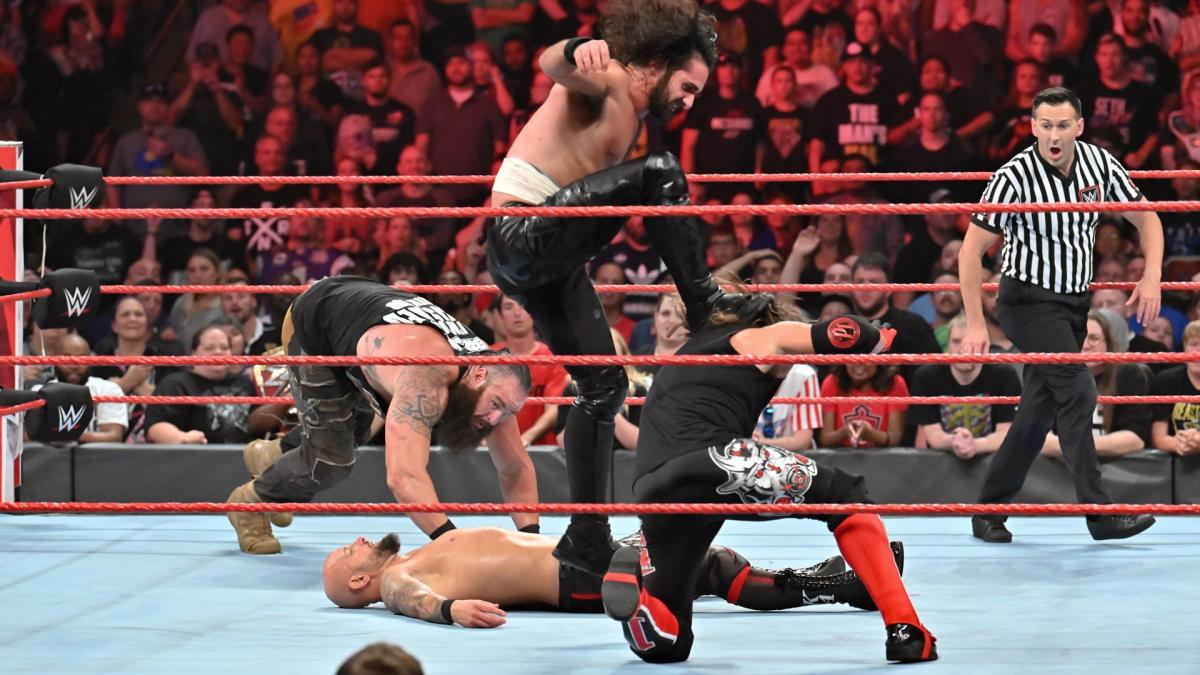 Rollins SuperKicks Gallows. Gallows tags in Anderson. Rollins hits The SlingBlade. Rollins with three running forearm smashes. Gallows goes for a Bodyslam, but Rollins lands back on his feet. Rollins sends Gallows tumbling to the floor. Rollins lands The Suicide Dive. Rollins with The Falcon Arrow for a two count. Anderson launches Rollins to the ring apron. Styles shoves Rollins off the top turnbuckles. Anderson tags in Gallows. The OC delivers their Belly to Back Suplex/NeckBreaker Combination for a two count. Frequent tags from The OC. Rollins negates The Magic Killer. The OC double teams Rollins. Anderson dumps Rollins out of the ring. Shoulder Block Party. Anderson goes for a Belly to Back Suplex, but Rollins lands back on his feet. Rollins ducks a clothesline from Anderson. Rollins tags in Strowman. Strowman with two shoulder tackles. Strowman levels Anderson with a Body Avalanche. Strowman runs through Gallows. Rollins connects with The Curb Stomp. Stromwan plants Anderson with The Running PowerSlam to pickup the victory.