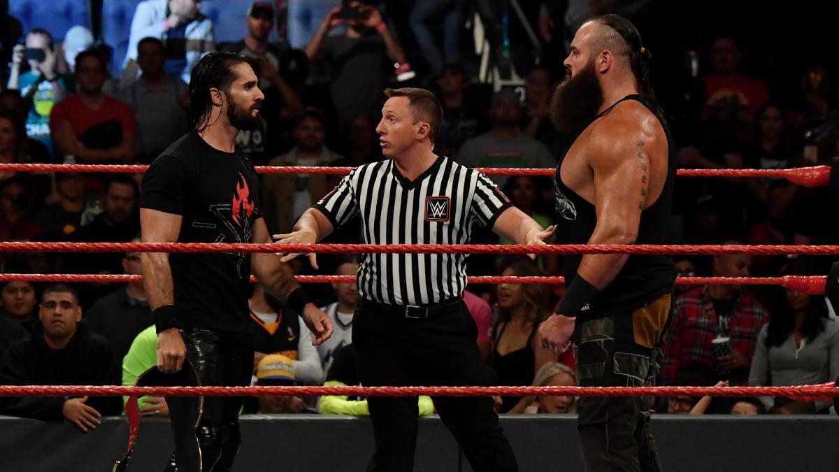Rollins immediately goes after the left hamstring of Strowman. Strowman blocks a boot from Rollins. Strowman with a straight right hand. Strowman with two shoulder tackles. Strowman tells Rollins to get up. Rollins avoids The Body Avalanche. Rollins ducks a clothesline from Strowman. Rollins applies a sleeper hold. Strowman dumps Rollins back first on the canvas. Strowman hits The Concrete Sledge. Rollins regroups on the outside. Strowman applies The Bear Hug. Rollins ducks two clotheslines from Strowman. Rollins dropkicks the left knee of Strowman. Rollins goes for The Pedigree, but Strowman counters with a Back Body Drop.