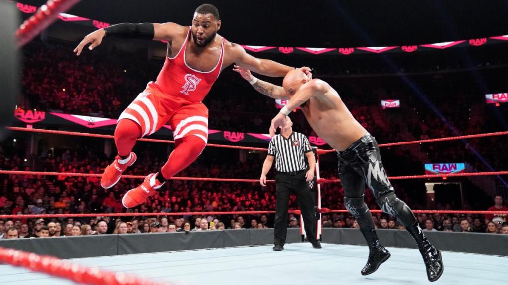 McIntyre applies a rear chin lock on the middle rope. McIntyre has complete control of the match. McIntyre with a Suplex Toss. McIntyre poses for the crowd. McIntyre stomps on Ricochet’s face. McIntyre applies another arm-bar. Ricochet with three haymakers. McIntyre answers with a heavy chop. McIntyre goes for a Bodyslam, but Ricochet lands back on his feet. Ricochet slips over McIntyre’s back. McIntyre catches Ricochet in mid-air. McIntyre goes for a Vertical Suplex, but Ricochet counters with a high knee strike. Ricochet dives over McIntyre. Ricochet with a corner dropkick. McIntyre decks Ricochet with a back elbow smash. Ricochet dropkicks McIntyre off the ring apron. Ricochet with a Flying Cannonball Senton through the ropes. McIntyre starts wearing down Ricochet during the commercial break.