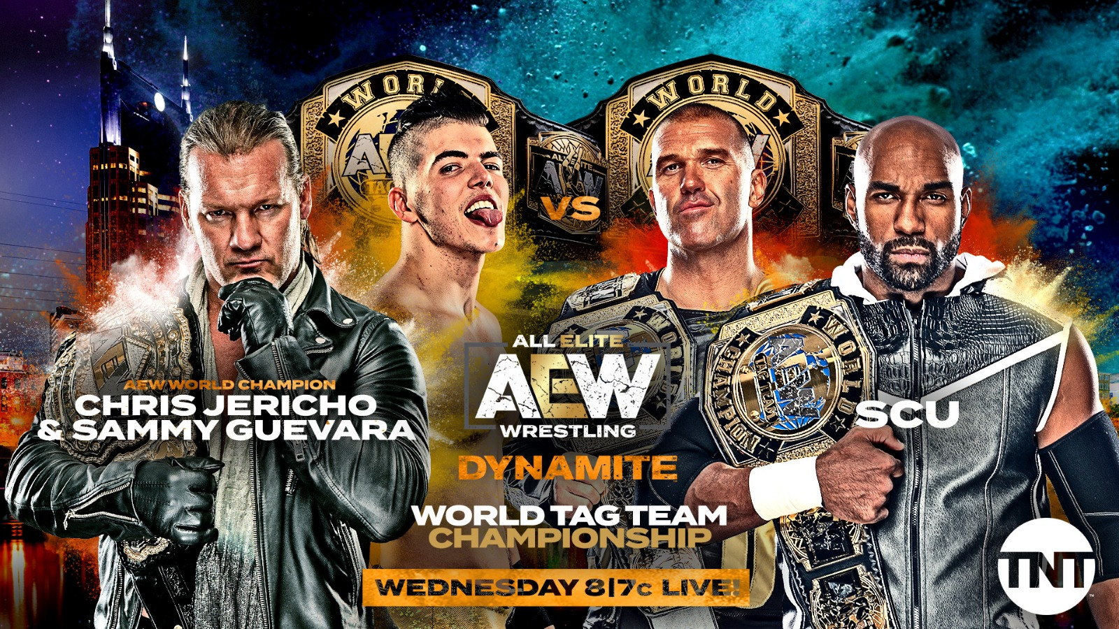 Kazarian and Jericho will start things off. Collar and Elbow Tie Up. Kazarian backs Jericho into the turnbuckles. Jericho argues with the referee. Lockup in the center of the ring. Kazarian ducks a clothesline from Jericho. Kazarian with two deep arm-drags. Kazarian applies an arm-bar. Jericho with a forearm smash. Jericho unloads two knife edge chops. Kazarian slips over Jericho’s back. Kazarian dropkicks Jericho. Jericho tags in Guevara. Kazarian with an arm-drag takeover. Kazarian applies another arm-bar. Kazarian brings Guevara to the corner. Kazarian tags in Sky. Sky with a Flying Double Axe Handle Strike. Sky with a Pendulum BackBreaker for a one count. SCU are cutting the ring in half.