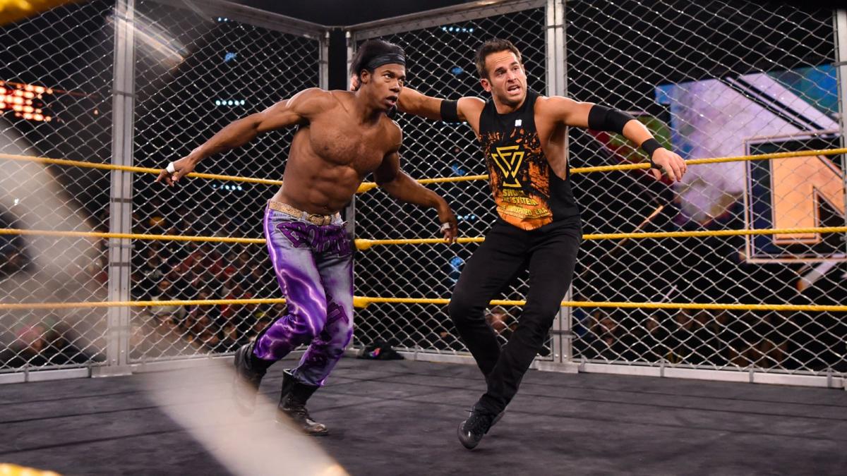 Strong pulls Dream back inside the ring. Dream stops Strong in his tracks. Dream with Two Dream Valley Drivers. Dream climbs up the cage. The Undisputed Era starts running interference. Dream uses the kendo stick to knock Fish and O’Reilly off the cage. Dream throws Adam Cole off the top turnbuckle. Dream allows Strong to escape the cage. After the match, Dream locks the cage door. Dream switches his focus to Cole. Dream tees off on Cole. Dream repeatedly whips Cole and Strong with the kendo stick. Dream negates The SuperKick. Dream catapults Cole into Strong. Strong gets crotched on the top turnbuckle. Dream plants Cole with The Dream Valley Driver on the chair. Dream poses with The NXT Championship to close the show.