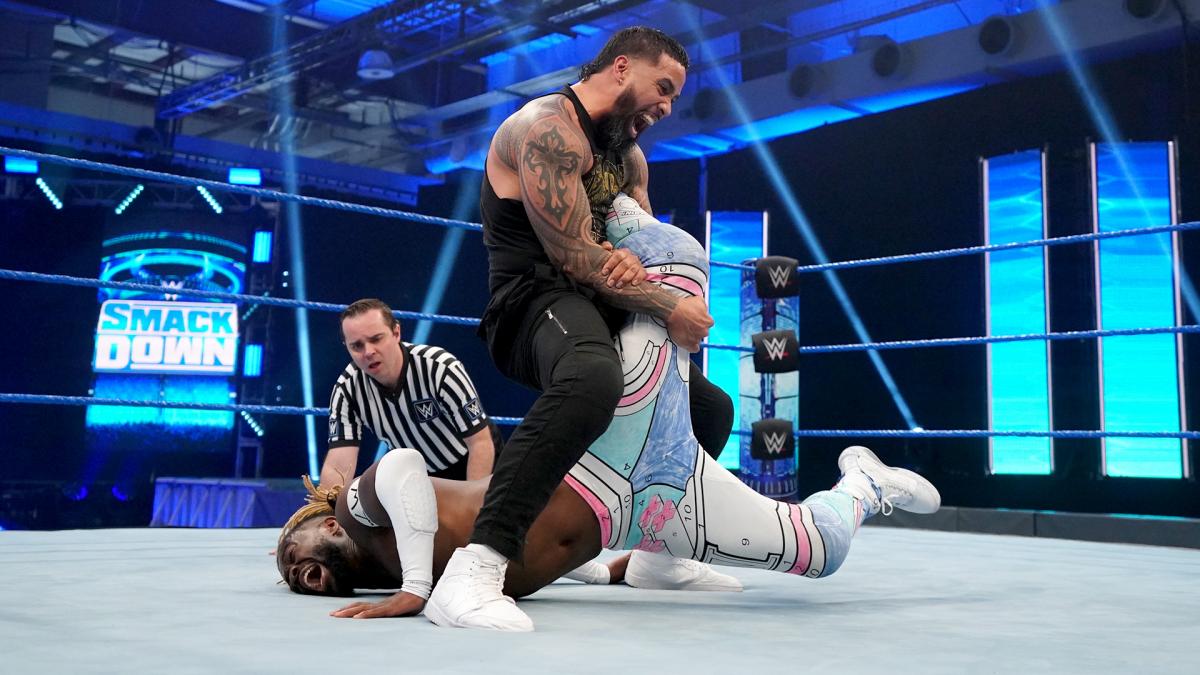 Big E goes for The Big Ending, but Jey gets in the way. The Usos with a Double Back Drop for a two count. Jey plays to the empty crowd. Jey delivers The Running StinkFace. Jey tags in Jimmy. Jimmy goes for another Running StinkFace, but Big E counters with The Uranage Slam. Kofi and Jey are tagged in. Kofi with a SpringBoard Tomahawk Chop. Kofi with two double sledges. Kofi dropkicks Jey. Kofi follows that with a Jumping Clothesline. Kofi hits The New Day Boom Drop. Kofi goes for The Trouble In Paradise, but Jey ducks out of the way. Jey thrust kicks the midsection of Kofi. Kofi with a Flying HeadScissors TakeOver. Kofi goes for a Leaping Double Foot Stomp, but Jey counters with a single leg pick. Jey applies the single leg crab. Kofi uses his feet to create separation. Kofi drops Jey with The SOS for a two count.