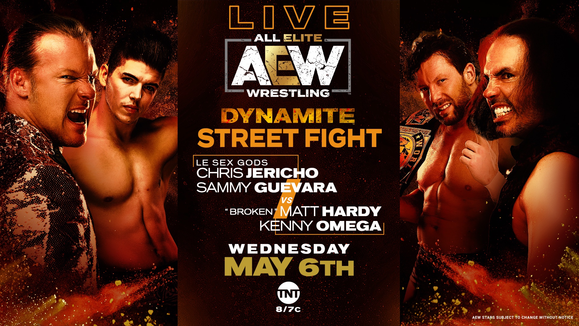 Jericho throws Hardy into the right entrance tunnel. Jericho and Guevara starts double teaming Omega. Guevara with a corner clothesline. Jericho unloads two knife edge chops. Double Vertical Suplex. LeSex Gods Pose. Omega is trying to fight from underneath. Jericho scores the elbow knockdown. Jericho lands The LionSault. Hardy with two clotheslines. Hardy with a Back Body Drop. Hardy follows that with The Side Effect. Guevara with a pump knee strike into the midsection of Hardy. Short-Arm Reversal by Hardy. Hardy with The Side Effect on Guevara for a two count. Hardy kicks Jericho in the gut. Hardy hits The Twist Of Fate for a two count. Hardy denies The Pump Kick. Guevara with a Spin Kick to Hardy. Omega avoids The Spinning RoundHouse Kick. Omega drills Guevara with The Snap Dragon Suplex. Jericho attacks Omega with a baseball bat.