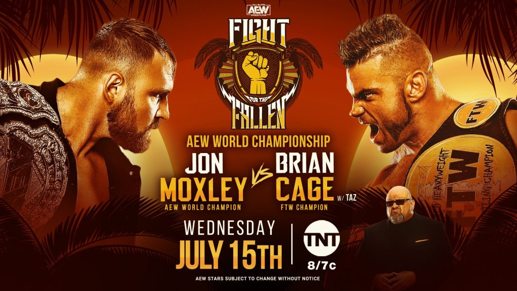 Cage applies The Camel Clutch. Moxley with heavy bodyshots. Cage with a running back elbow smash. Cage knocks Moxley off the ring apron. Moxley kicks Cage in the gut. Cage with a Vertical Suplex through a steel chair. Cage rolls Moxley back into the ring. Moxley with an inside cradle for a two count. Moxley sends Cage shoulder first into the ring post. Moxley rolls Cage over for a two count. Moxley with forearm shivers. Cage PowerSlams Moxley. Cage goes for The MoonSault, but Moxley ducks out of the way. Moxley drills Cage with Three Regal Knee Strikes. Lariat Exchange. Cage negates The Death Rider. Cage with a Jumping Knee Strike. Cage goes for a Discus Lariat, but Moxley counters with The Death Rider for a two count. Moxley puts Cage on the top turnbuckle. Moxley with The SuperPlex for a two count. Moxley applies The Kimura Lock. Cage BuckleBombs Moxley. Cage with The SuperPlex off the second rope. Moxley negates The Drill Claw. Moxley applies The Cross-Arm-Breaker. Moxley gives TAZ the middle finger. TAZ throws the orange towel into the ring. After the match, Cage clocks Moxley with The FTW Championship. Cage transitions into a ground and pound attack. The lights go out in the building. Darby Allin drives the skateboard into Cage’s face. TAZ pulls Cage out of the ring. TAZ is trying to restrain Cage on the stage to close the show.