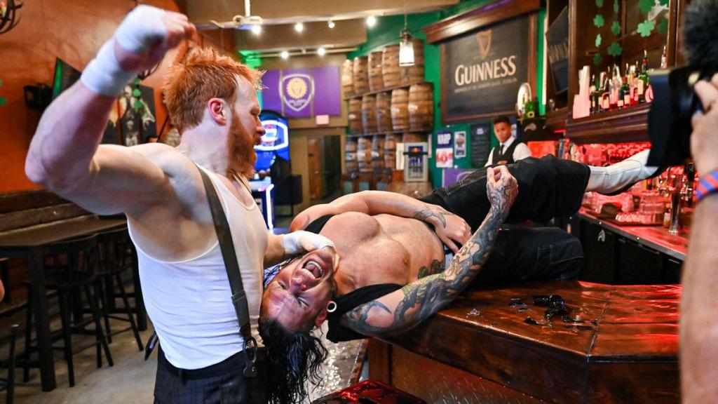 Hardy throws beer into Sheamus face. Hardy is throwing haymakers at Sheamus. All hell starts breaking loose. Hardy slams Sheamus head on the bar table. Sheamus delivers a gut punch. Sheamus drives his knee into the midsection of Hardy. Sheamus with a knee lift. Sheamus follows that with a side slam on the bar table. Sheamus is raining down haymakers. Sheamus drags Hardy around the table. Sheamus with clubbing blows to Hardy’s chest. Hardy with a Flying Clothesline off the table. Sheamus shoves Hardy into the wall. Hardy side steps Sheamus into the jameson kegs. Hardy is throwing basketballs at Sheamus. The action spills into the bathroom. Sheamus slams Hardy’s head on the sink. Sheamus punches Hardy in the back. Sheamus jams Hardy’ face into the toilet. Sheamus talks smack to Hardy. Hardy decks Sheamus with a back elbow smash.