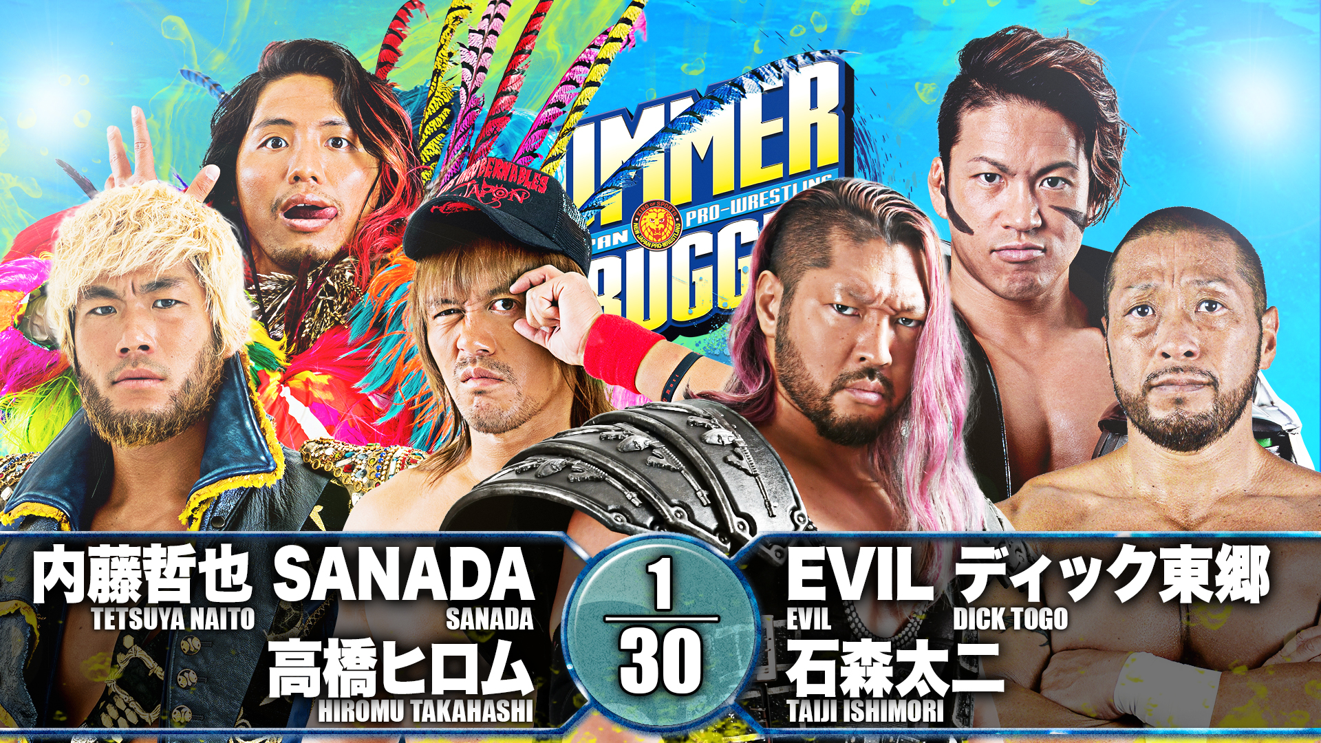 Togo avoids The Missile Dropkick. Sanada blocks a boot from Togo. Sanada with a single leg takedown. EVIL negates The Paradise Lock. EVIL knocks Naito off the ring apron. Togo is choking Sanada with his boot. EVIL and Naito are brawling on the outside. Togo rams Sanada’s face across the top strand. Following a snap mare takeover, Togo with a running fist drop for a one count. Togo applies a rear chin lock. Togo rams his boot across Sanada’s face. Sanada goes for a sunset flip, but Togo counters with a basement haymaker. Togo slams Sanada’s head on the exposed steel. Togo tags in EVIL. EVIL applies a wrist lock. EVIL repeatedly whips Sanada into the exposed steel. EVIL stomps on Sanada’s chest. EVIL tags in Ishimori. Ishimori with four haymakers. Sanada with forearm shivers. Ishimori drives his knee into the midsection of Sanada. Following a snap mare takeover, Ishimori cranks on Sanada’s neck for a two count. Ishimori with a straight right hand. Sanada reverses out of the irish whip from Ishimori. Ishimori goes for a HandSpring Back Elbow Smash, but Sanada blocks it.