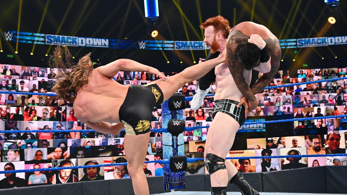 Corbin and Sheamus gangs up on Corbin. Corbin delivers a gut punch. Corbin blasts Uso off the apron. Sheamus slaps Riddle in the chest. Corbin with a straight right hand. Double Irish Whip. Riddle kicks Corbin in the face. Riddle launches Sheamus over the top rope. Corbin hits The SpineBuster for a two count. Corbin clotheslines Uso for a two count. Corbin puts his knee on the back of Uso’s neck. Sheams uppercuts Uso. Corbin knocks Riddle off the apron. Corbin and Sheamus are mauling Uso in the corner. Riddle drops Corbin with a RoundHouse Kick. Uso starts peppering Sheamus with uppercuts. Sheamus kicks Uso in the chest. Sheamus whips Uso across the ring. Uso returns the favor and kicks Sheamus in the chest. Riddle delivers his combination offense. Corbin blocks a boot from Uso. Uso with a Spinning Enzuigiri. Riddle ducks a clothesline from Sheamus. Riddle with an OverHead Kick. Stereo Flying Forearm Shivers. Corbin hits The Deep Six. Sheamus follows that with The Irish Curse BackBreaker. Simultaneous covers for a two count.