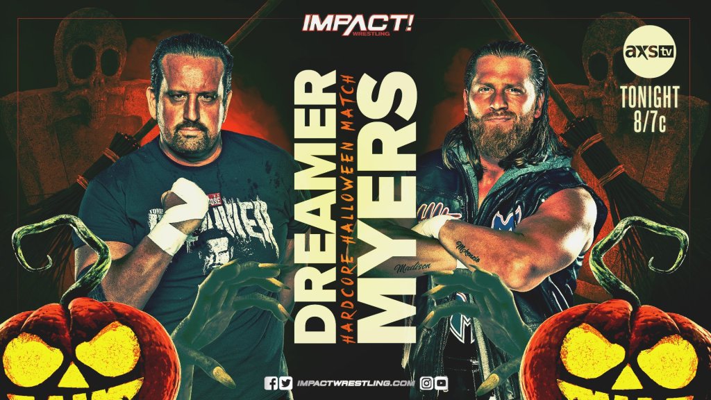 Myers applies a rear chin lock. Dreamer with heavy bodyshots. Myers drives his knee into the midsection of Dreamer. Dreamer unloads a flurry of left jabs. Myers thrust kicks the midsection of Dreamer. Dreamer responds with The Bionic Elbow. Myers decks Dreamer with a back elbow smash. Dreamer hits The Cutter for a two count. Dreamer attacks Myers with a street sign. Dreamer spills candy corn and thumbtacks on the canvas. Myers has Dreamer perched on the top turnbuckle. Myers with a thumb to the eye. Myers with two haymakers. Myers goes for The SuperPlex, but Dreamer blocks it. Dreamer starts biting Myers forehead. Dreamer sends Myers crashing into the candy corn/thumbtacks for a two count. Dreamer rolls a table into the ring. Myers clotheslines Dreamer. Myers breaks a kendo stick in half. Myers says that he’s going to end Dreamer’s career. Swoggle attacks Myers with barbecue tongs. Dreamer connects with The Death Valley Driver through the table to pickup the victory.