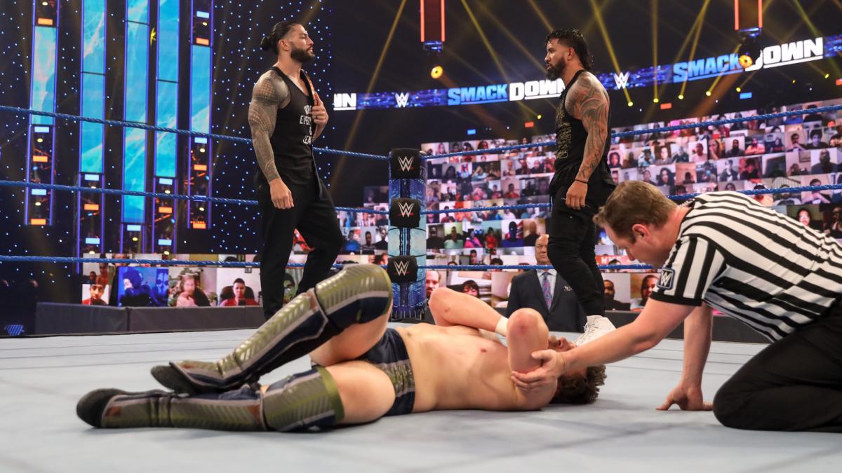 Bryan launches Jey over the top rope. Bryan goes for The Suicide Dive, but Jey counters with The SuperKick. Jey goes for The Uso Splash, but Bryan gets his knees up in the air. Bryan applies The Lebel Lock. Jey grabs the bottom rope which forces the break. Bryan delivers more YES! Kicks. Bryan with The Corner Dropkick. Jey responds with Two SuperKicks. Jey connects with The Uso Splash to pickup the victory. After the match, Jey tells Roman Reigns that he’s with him. Jey SuperKicks Bryan. Jey delivers another Uso Splash. Roman wants Jey to make Bryan understand. Jey pulls Bryan out of the ring. Jey tees off on Bryan. Jey throws Bryan into the steel ring steps. Jey has officially snapped. Jey starts choking Bryan. Jey lands The Uso Splash through the announce table. Jey continues to rag doll Bryan to close the show.