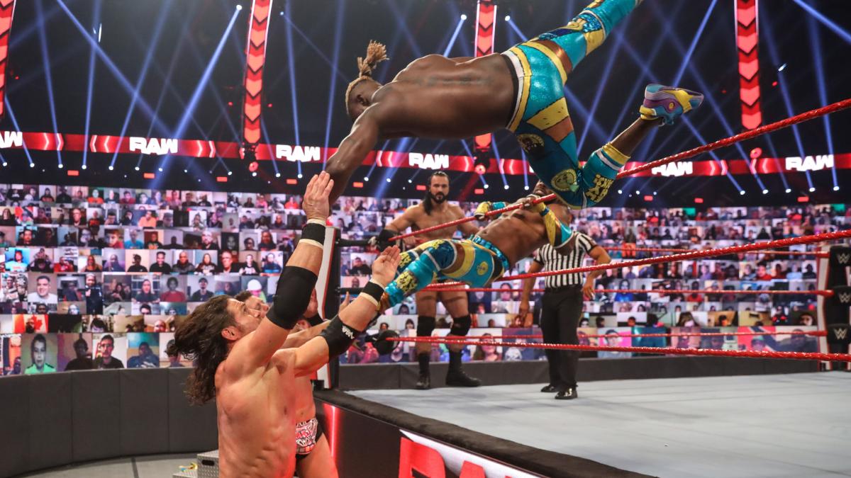Orton continues to ignore Miz and Morrison. Miz tags in Morrison. Miz catapults Woods into a forearm smash from Morrison. Morrison with The SlingShot Elbow Drop for a two count. Morrison applies a front face lock. Morrison tags in Miz. Double GutBuster. Miz knocks Kofi off the apron. Corner IT! Kicks. Woods creates distance with a Running Lariat. McIntyre and Morrison are tagged in. McIntyre with two clotheslines. OverHead Belly to Belly Suplex Party. McIntyre drops Morrison with a NeckBreaker. McIntyre pops back on his feet. McIntyre connects with The Future Shock DDT. McIntyre stares down Orton. McIntyre tells Orton to bring it. Orton heads to the backstage area with the WWE Championship. Morrison rolls McIntyre over for a two count. Miz throws Woods into the ringside barricade. Morrison ducks a clothesline from McIntyre. Morrison wipes out Kofi with The Tornillo. McIntyre hits The SpineBuster. McIntyre HeadButts Morrison in mid-air. McIntyre plants Morrison with The ClayMore Kick.