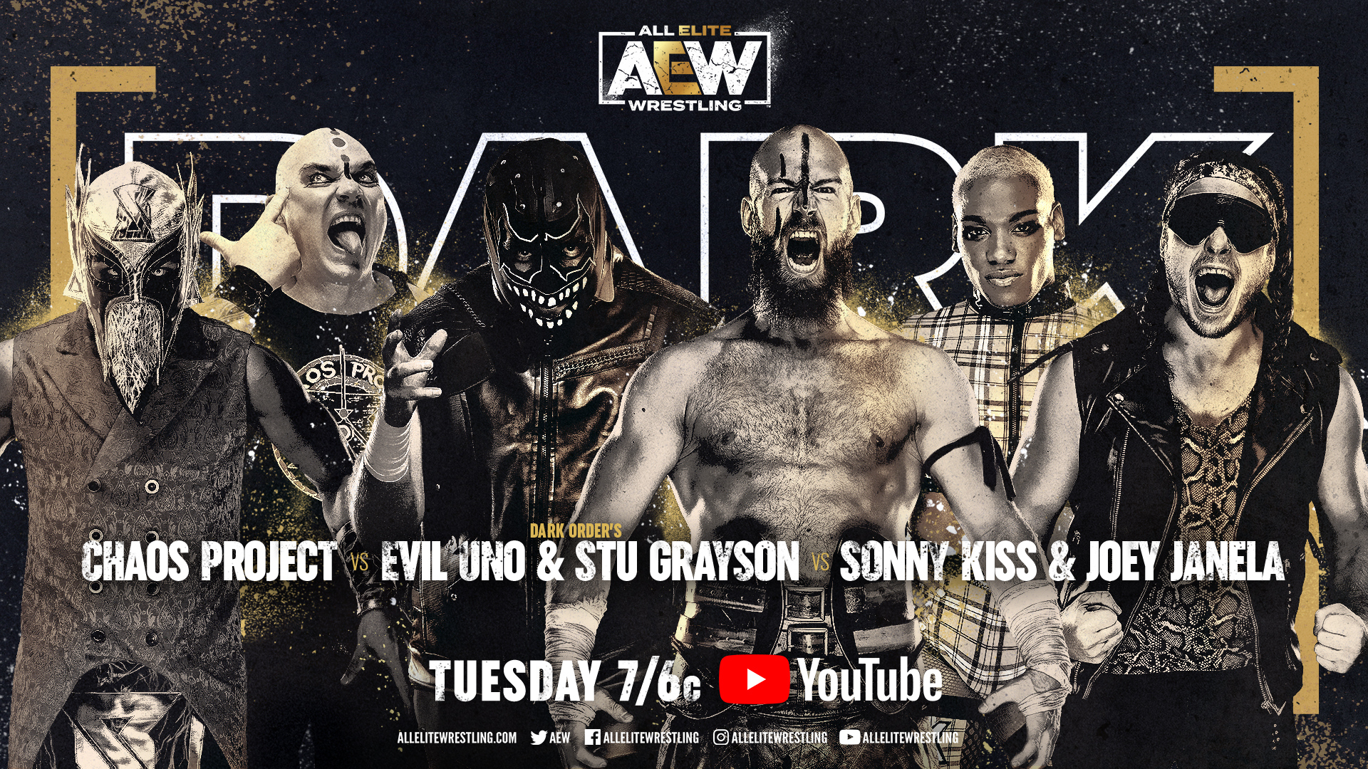 Doomsday Device for a two count. Janela whips Serpentico across the ring. Serpentico holds onto the ropes. Serpentico sends Janela crashing to the outside. Serpentico ducks a clothesline from Kiss. Serpentico nails Kiss with The Spike DDT. Simultaneous tag to Grayson. Assisted PowerBomb. Grayson drills Janela with The SpringBoard DDT on the apron. Uno lands The Swanton Bomb for a two count. Uno goes for a Bodyslam, but Kiss lands back on his feet. Kiss splits under a clothesline from Uno. Kiss with a RoundHouse Kick. Luther tags himself in. Luther throws Serpentico into Grayson. Luther with a Spinning Leg Lariat to Uno. Assisted Reverse Suplex. Serpentico knocks Uno off the apron. Chaos Project have a disagreement. Luther throws Serpentico into Uno and Kiss on the outside. Luther with a Flying Cannonball Senton off the apron. Luther rolls Kiss back into the ring. Luther kicks Kiss in the ribs. Chaos Project connects with The Creeping Death for a two count. Grayson tags himself in. Grayson with a Pump Knee Strike. Grayson tags in Uno. Grayson rolls Kiss back into the ring. Kiss crawls under Uno’s legs. Kiss tags in Janela. Janela goes for The Flying Crossbody Block, but Grayson blocks it. Dark Order plants Janela with The Fatality to pickup the victory.