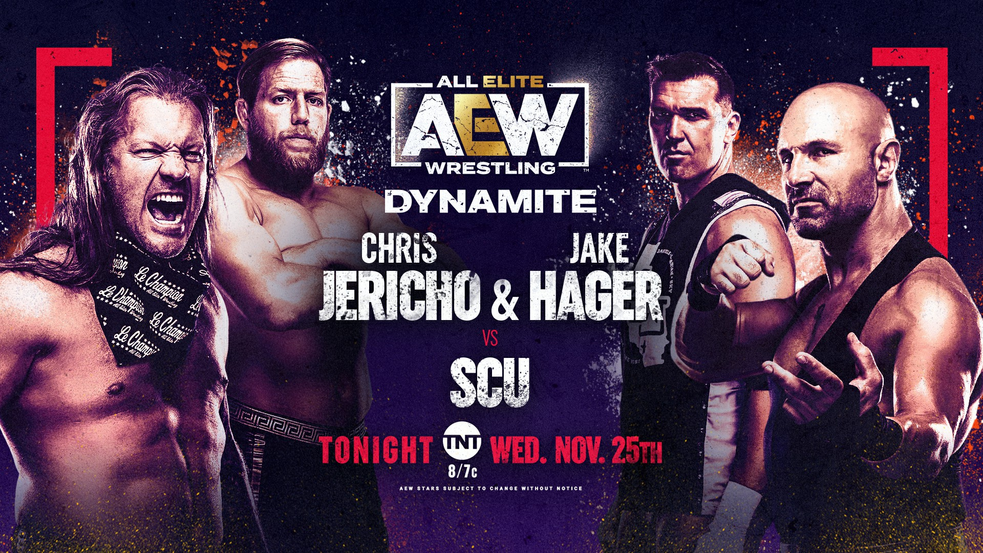 Kazarian side steps Hager into the turnbuckles. Kazarian dropkicks Hager. Jericho reverses out of the irish whip from Kazarian. Kazarian with The Flying Forearm Smash. Kazarian with The Guillotine Leg Drop to Hager. Kazarian bodyslams Jericho. Kazarian with The SpringBoard Leg Drop for a two count. Kazarian knocks Sammy Guevara off the ring apron. Kazarian with The Flying Hurricanrana to Ortiz. Jericho kicks Kazarian in the gut. Jericho with a knife edge chop. Kazarian reverses out of the irish whip from Jericho. Daniels with an Apron Enzuigiri. Kazarian tags in Daniels. Daniels with The Flying Foot Stomp. Daniels lands The Suicide Dive. Daniels with The Flying Crossbody Block for a two count. Jericho nails Daniels with a throat chop. Jericho tags in Hager. Hager clotheslines Daniels. Hager goes for a Belly to Back Suplex, but Daniels lands back on his feet. Daniels kicks Hager in the face. Daniels drops Hager with The Diving FlatLiner. Daniels connects with The BME for a two count. Kazarian with a straight right hand. MJF clocks Daniels with The Dynamite Ring. Jericho plants Daniels with The Judas Effect. Hager hooks the outside leg to pickup the victory. After the match, Kazarian punches MJF. The Inner Circle gangs up on SCU. Scorpio Sky storms into the ring with a steel chair to make the save.