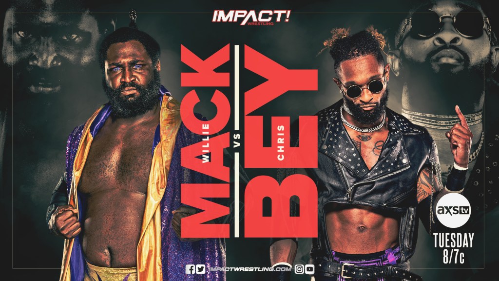 Mack goes for a Bodyslam, but Bey lands back on his feet. Bey delivers the chop block. Bey with an elbow drop. Bey applies the single leg crab. Mack with desperation haymakers. Forearm Exchange. Bey kicks the left knee of Mack. Mack clotheslines Bey. Mack with a running forearm smash. Mack scores the elbow knockdown. Mack bodyslams Bey. Mack with a Leaping Knee Drop for a two count. Bey denies The Stunner. Bey with a back heel trip. Bey with a jackknife cover for a two count. Bey kicks Mack in the face. Bey drills Mack with The Canadian Destroyer for a two count. Bey talks smack to Mack. Mack blocks a boot from Bey. Bey slaps Mack in the face. Tip Up by Mack. Mack with a Pop Up Forearm Smash. Mack connects with The Stunner to pickup the victory. After. the match, Moose Spears Mack. Rich Swann storms into the ring. Swann tees off on Moose. Swann ducks a clothesline from Moose. Swann drops Moose with The Windmill Kick. Bey plants Swann with The Art Of Finesse. Bey poses with the IMPACT World Championship to close the show.