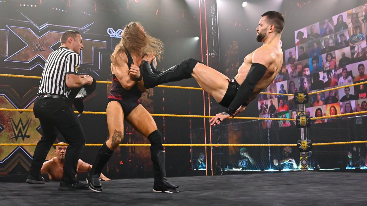Balor scores the elbow knockdown. Dunne reverses out of the irish whip from Balor. Balor dropkicks the left knee of Dunne. Balor with a knife edge chop. Balor with a double leg takedown to Lorcan. Balor follows that with a double foot stomp. Balor kicks Burch in the chest. Balor goes for a single leg crab, but Dunne counters with an inside cradle for a two count. Balor ducks a clothesline from Dunne. Balor with a Spin Out Elbow Drop for a two count. Strong throws Lorcan into Burch. Strong with a Wrecking Ball Dropkick. Dunne with a Step Up Enzuigiri. Misfired Signature Moves. Balor kicks Dunne in the face. Balor hits The SlingBlade. The referee is distracted by Burch. Balor inadvertently dropkicks Dunne into the referee. Balor blasts Burch off the apron. Adam Cole shoves Balor off the top turnbuckle. Cole nails Kyle with The Pump Kick. Cole drills Kyle with The BrainBuster on the steel ring steps. Strong drops Lorcan with a Flying Knee Strike. Strong grabs the NXT Title. Balor inadvertently clocks Strong with The Overhead Kick. Dunne connects with The Bitter End to pickup the victory. After the match, Cole SuperKicks Balor. Cole poses with the NXT Title to close the show.