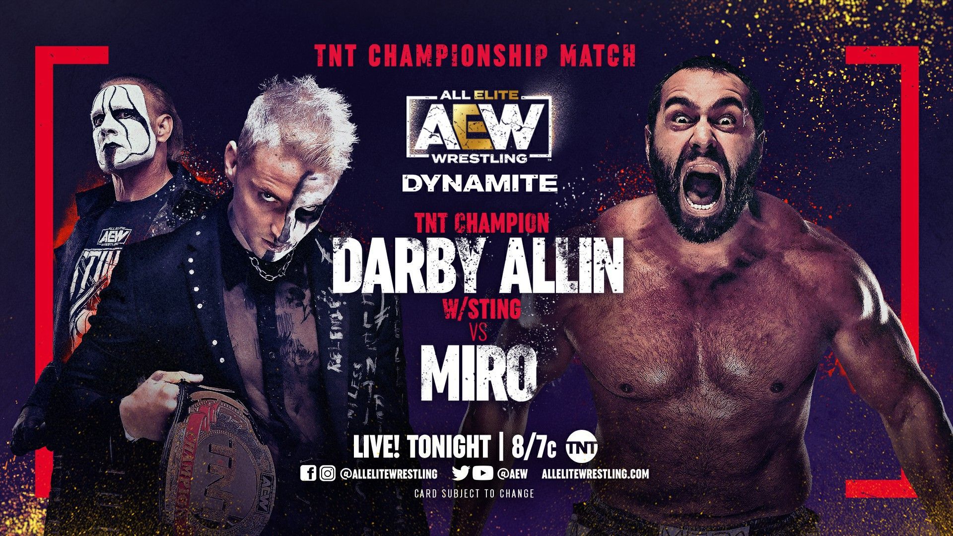 Allin pinches the nose of Miro. Miro runs Allin into the AEW Wall. Miro hammers down on the right shoulder of Allin. Miro sends Allin shoulder first into the middle turnbuckle pad. Miro bodyslams Allin into the ropes. Allin gives Sting a fist bump. Allin slaps Miro in the face. Allin kicks Miro in the face. Allin delivers a chop block. Allin hits The Flipping Stunner. Allin with an inside cradle for a two count. Allin drops Miro with The Stunner. Allin goes for The Coffin Drop, but Miro blocks it. Miro goes for a German Suplex, but Allin lands back on his feet. Allin side steps Miro into the turnbuckles. Allin rolls Miro over for a two count. Allin headbutts the midsection of Miro. Allin connects with The Canadian Destroyer for a two count. Allin applies The Fujiwara Arm-Bar. Miro makes Allin pass out to Game Over. After the match, Sky and Page gangs up on Sting. The Dark Order comes out to make the save. Lance Archer appears on the stage and points at the TNT Title to close the show.