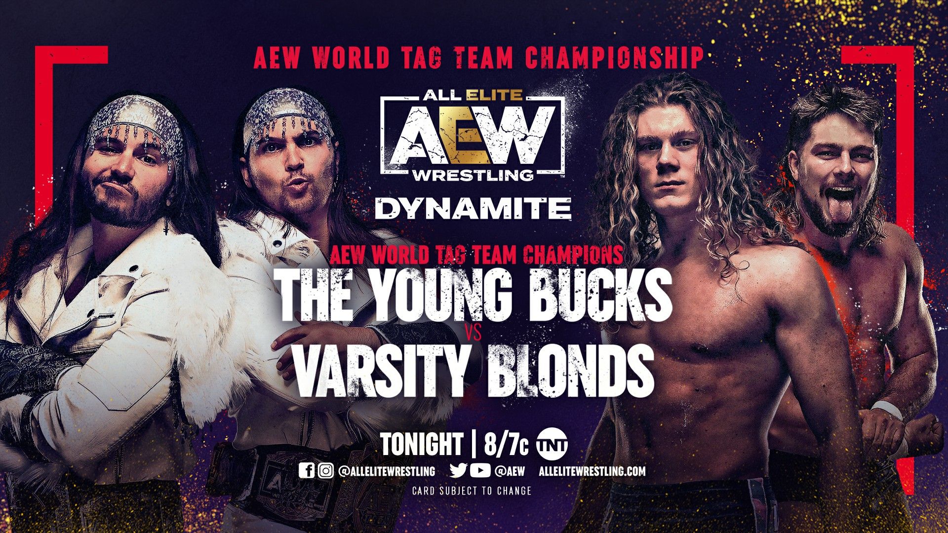 Don Callis joins the commentary team for this match. Nick Jackson and Griff Garrison will start things off. Collar and Elbow Tie Up. Garrison outpowers Nick. Nick side steps Garrison into the turnbuckles. Garrison leapfrogs over Nick. Garrison drops down on the canvas. Garrison with The Big Boot. Nick tags in Matt. Garrison ducks a clothesline from Matt. Varsity Blonds tees off on Matt. Garrison with another Big Boot. Garrison tags in Pillman. Pillman with a corner clothesline. Pillman with a knife edge chop. Stereo Dropkicks. Young Bucks regroups on the outside. Varsity Blonds blocks The Bucks. Pillman clotheslines Nick over the top rope. Pillman with a Hip Toss. Pillman with a deep arm-drag. Pillman applies an arm-bar. Pillman grabs a side wrist lock. Pillman tags in Garrison. Garrison with a double axe handle strike. Garrison tags in Pillman. Garrison whips Matt across the ring. Dropkick/SpineBuster Combination for a two count. Pillman applies a front face lock. Varsity Blonds works on the left wrist of Matt. Garrison bodyslams Matt. Garrison tags in Pillman.