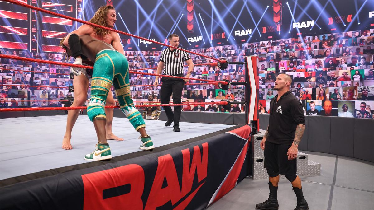 Kofi with a Baseball Slide Dropkick to Orton. Kofi dropkicks Riddle to the floor. Woods continues to play the trombone. Orton with a Belly to Back Suplex on the announce table. Kofi lands The Trust Fall. Riddle regains control of the match during the commercial break. Riddle teep kicks Kofi into the turnbuckles. Riddle with two flying forearm smashes. Riddle with The Exploder Suplex. Riddle follows that with The PK. Riddle applies a front face lock. Riddle goes for a Vertical Suplex, but Kofi lands back on his feet. Kofi kicks Riddle in the face. Kofi with a SpringBoard Hurricanrana. Kofi with a Running Foot Stomp for a two count. Kofi kicks the right hamstring of Riddle. Kofi with a Rebound Splash for a two count. Kofi with The Pendulum Kick.