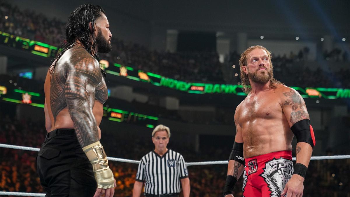 Collar and Elbow Tie Up. Reigns backs Edge into the turnbuckles. The referee calls for a clean break. Reigns pie faces Edge. Strong lockup. Stalemate in the corner. Edge slaps Reigns in the face. Back to the collar and elbow tie up. Edge with a waist lock go-behind. Edge brings Reigns down to the mat. Edge grapples around Reigns. Edge is playing mind games with Reigns. Strong lockup. Edge drop steps into a side headlock. Reigns whips Edge across the ring. Reigns drops Edge with a shoulder tackle. Reigns talks smack to the crowd. Edge regroups on the outside. Collar and Elbow Tie Up. Edge applies a wrist lock. Edge hyperextends the left wrist of Reigns. Reigns rocks Edge with a forearm smash. Reigns HeadButts Edge. Reigns hammers down on the back of Edge’s neck. Reigns slams Edge’s head on the top turnbuckle pad. Reigns with three corner clotheslines. The referee admonishes Reigns. Edge wraps the left shoulder of Reigns around the top rope. Edge repeatedly sends Reigns shoulder first into the steel ring post. Reigns escapes The Fujiwara Arm-Bar. Reigns talks strategy with Paul Heyman.