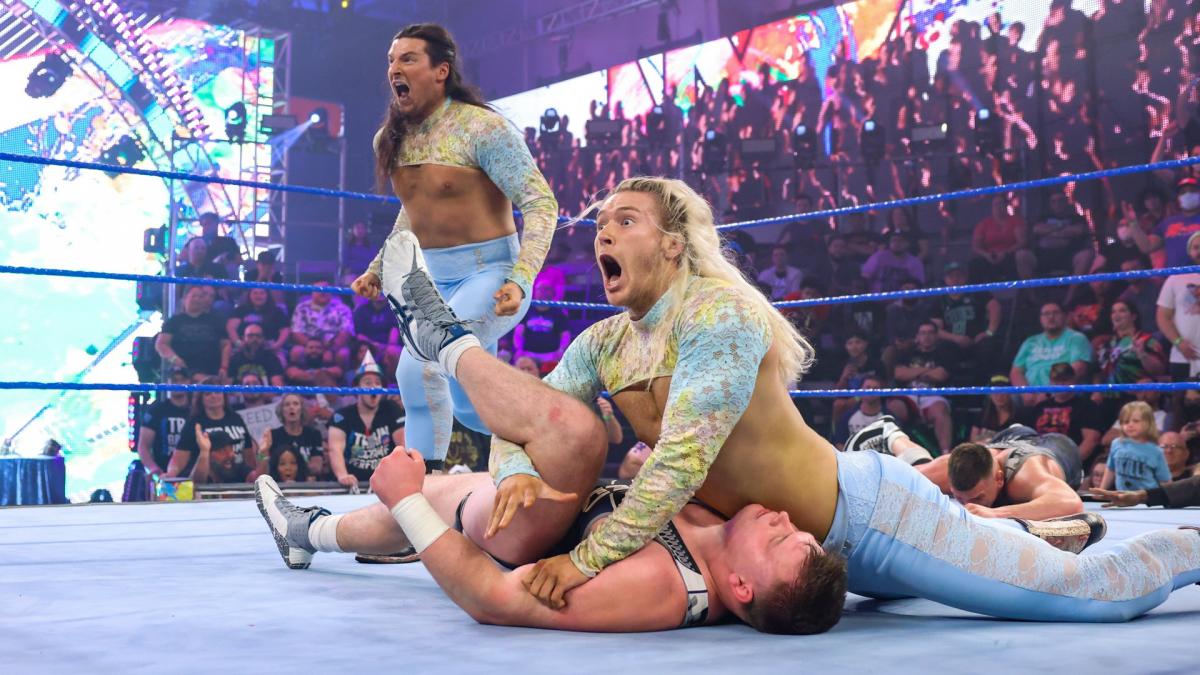 Pretty Deadly attacks Creed Brothers before the bell rings. Julius struggles to get back on his feet. Prince drives Julius back first into the turnbuckles. Prince with clubbing shoulder blocks. Prince whips Julius across the ring. Prince scores the elbow knockdown for a two count. Prince punches Julius in the back. Prince with a clubbing blow to Julius chest. Prince tags in Wilson. Prince grabs Julius from behind. Wilson with a gut punch. Wilson applies a leg lock. Wilson with three elbow drops. Wilson tags in Prince. Prince drives his knee into the midsection of Julius. Prince with an elbow drop for a two count. Prince with two uppercuts. Julius is displaying his fighting spirit. Prince drives his knee into the midsection of Julius. Julius with a single leg takedown. Prince tags in Wilson.