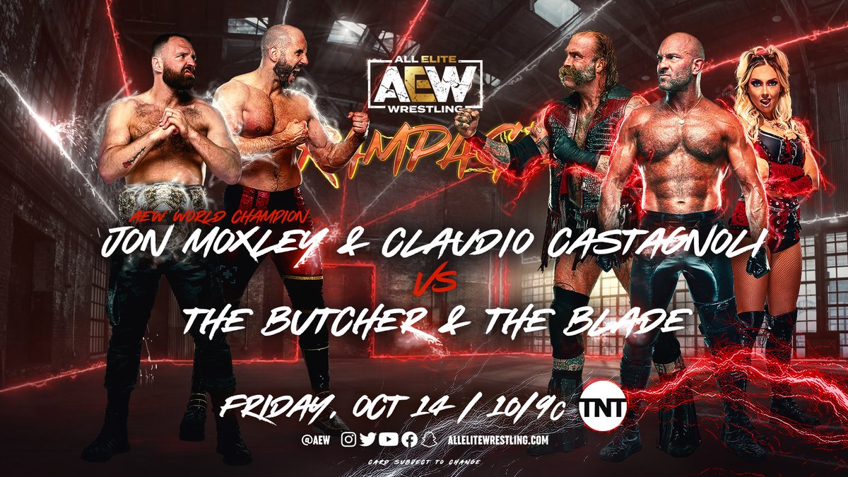 Castagnoli ducks a clothesline from Butcher. Blade with a knee lift. Butcher clotheslines Castagnoli. Flying Clothesline/Vertical Suplex Combination for a two count. Butcher goes for a PowerBomb, but Castagnoli lands back on his feet. Castagnoli uppercuts Butcher. Castagnoli with a Falling Lariat. Moxley and Blade are tagged in. Moxley drops Blade with The Cutter. Moxley knocks Butcher off the apron. Moxley lands The Suicide Dive. Moxley with a corner clothesline. Moxley puts Blade on the top turnbuckle. Moxley with a knife edge chop. Moxley rakes the back of Blade. Moxley with The SuperPlex. Moxley nails Blade with The PileDriver for a two count. Moxley repeatedly stomps on Blade’s face. Butcher with a Running Crossbody Block. Blade tags in Butcher. Butcher & Blade goes for Drag The Leg, but Castagnoli gets in the way. Stereo Forearms. Stereo Lariats. Moxley tags in Castagnoli. The BCC are putting the boots to Butcher and Blade. Moxley hits The Death Rider. Castagnoli connects with The Ricola Bomb to pickup the victory.