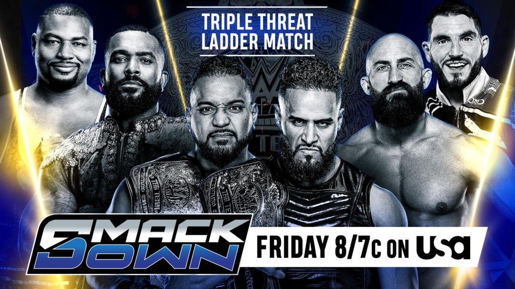Loa throws a ladder into Ciampa’s face. Loa with repeated ladder shots. Stereo SuperKicks. Loa has a ladder wrapped around his neck. DIY delivers Meeting In The Middle. Dawkins rips Gargano off the apron. Gargano with The Apron Enzuigiri. Gargano with The Slingshot Spear. Ciampa follows that with a Running Knee Strike. Dawkins rips Ciampa off the ladder. Forearm Exchange. Dawkins puts Ciampa on his shoulders. Ford hits The Super BlockBuster over the ladder. Tonga shoves Dawkins off the ladder. Loa HeadButts Dawkins. Tonga drives a ladder into Dawkins chest. B-Fab snatches a steel chair out of Tonga’s hands. DIY attacks GOD with multiple chairs. Ciampa gangs up on Loa. Ciampa lays Loa flat on the table. Ford with From The Heavens through the table on the floor. DIY and Dawkins gangs up on Tonga. DIY and Dawkins with The Shield Bomb through the announce table. Double SuperKick to Dawkins. Ciampa sends Dawkins into the timekeeper’s area. Ford with The Apron Enzuigiri. Ford springboards onto the other side of the ladder. All four men are fighting on the same ladder. Ciampa with The Avalanche Side Russian Leg Sweep through a ladder in the corner. Loa sends Gargano and Ford crashing through the other ladder in the opposite corner. Loa procures the tag team titles to pickup the victory. After the match, GOD celebrates with The Bloodline as the show goes off the air.